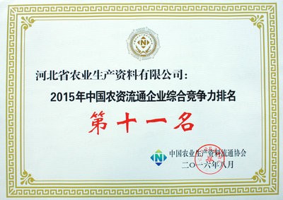 公司榮獲2015年中國(guó)農(nóng)資流通企業(yè)綜合競(jìng)爭(zhēng)力排名第十一名