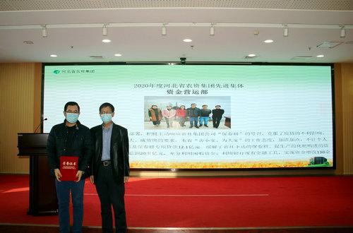 侯軍合(右)為資金營運部頒發(fā)“2020年度先進集體”榮譽證書