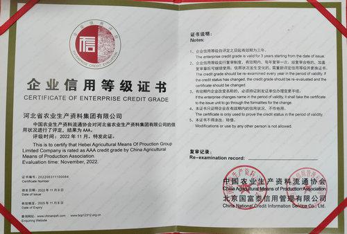 本網(wǎng)訊 近日,中國農(nóng)資流通協(xié)會發(fā)布2022年度中國農(nóng)資流通行業(yè)企業(yè)信用等級評價(jià)結(jié)果,河北省農(nóng)資集團(tuán)公司再度獲評企業(yè)信用等級AAA級,屬于行業(yè)信用評價(jià)最高等級。