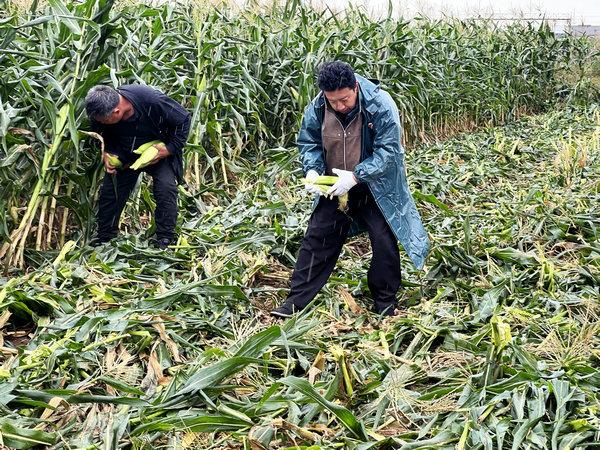 公司種植的400多畝甜玉米如果錯過收獲期,將損失巨大??捎陝菀恢蔽赐?,田間泥濘不堪,常規(guī)收割機無法作業(yè),豐安公司經理劉佳緊急調度了幾臺“四不像”拖拉機及裝載機,全體員工冒雨下地,搶收作業(yè)。有些低洼地塊連拖拉機也進不去,劉佳帶領劉磊、石峰、化立成、王繼唯、張海森等員工,跳進齊膝的泥水里,一穗一穗地徒手掰下,再深一腳淺一腳地肩扛手提運到地頭。雨水混著汗水,衣服沾滿泥漿,每個人都在拼盡全力,只為多搶回一穗玉米,保護豐收果實。