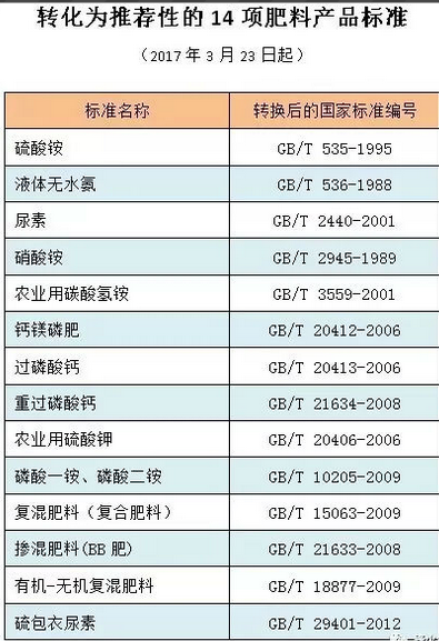 2017年3月23日,國(guó)家質(zhì)量監(jiān)督檢驗(yàn)檢疫總局、國(guó)家標(biāo)準(zhǔn)化管理委員會(huì)聯(lián)合發(fā)布公告,將1077項(xiàng)強(qiáng)制性國(guó)家標(biāo)準(zhǔn)轉(zhuǎn)化為推薦性國(guó)家標(biāo)準(zhǔn)。其中,涉及尿素、磷酸銨、硫酸銨等14項(xiàng)肥料產(chǎn)品國(guó)家標(biāo)準(zhǔn)。
